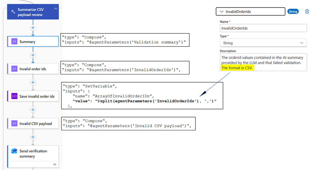 Goal: a machine-friendly list of identifiers the workflow can use deterministically. The key part of the description (highlighted in the image) is: “The format is CSV.” That single sentence is doing a lot of work: it tells the model to emit a comma-separated list, which you then convert into an array in the workflow using split(...). |