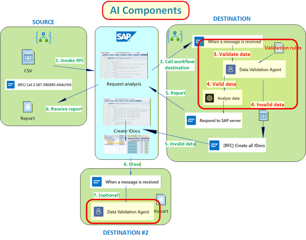 - AI agent phase (per-IDoc): reconstruct a CSV view from the incoming IDoc payload and (optionally) run the same validation logic.