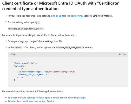 How to get JWT token of certificate-based SPN in logic app HTTP actionWhen working with Azure Logic Apps and needing to call an API secured with Azure AD, you might use a Service Principal Name (SPN) with certificate-based authentication to obtain a JSON Web Token (JWT). This article shows a brief guide on how to set this up and use it in an HTTP action within a Logic App Standard |