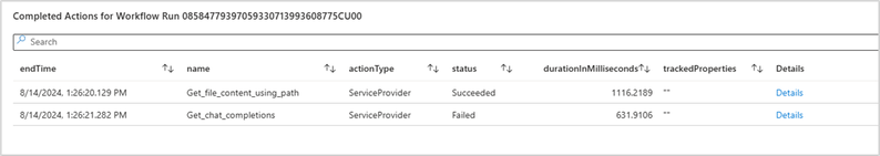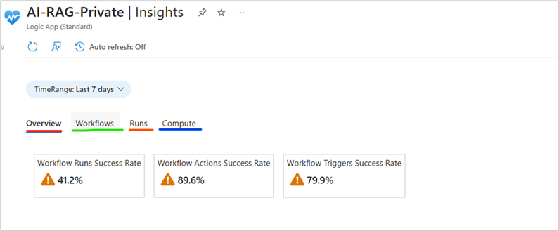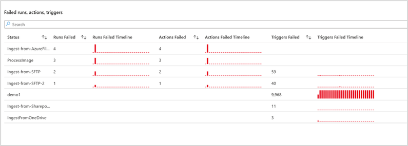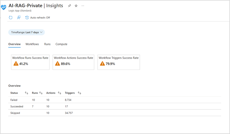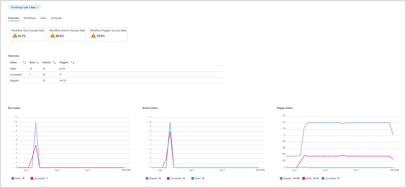 This section provides a bird’s eye view of your application’s health by displaying the success rates of runs, actions, and triggers. The accompanying table offers detailed counts of runs that have failed, succeeded, or been skipped.