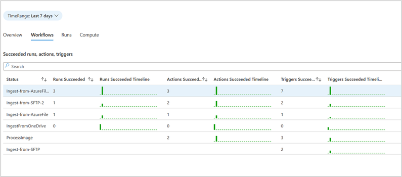 Additionally, trend charts illustrate the patterns of runs, actions, and triggers over the selected time range. This overview helps you quickly assess the status and timeline of your runs. If failures are detected, you can proceed to the workflows tab to pinpoint and analyze them within specific workflows.