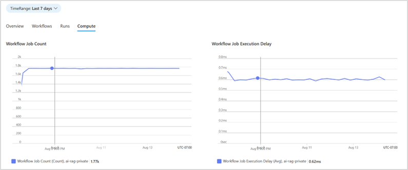 The first two charts display job count and execution delay in the underlying runtime engine. These metrics help diagnose unexpected performance issues by indicating whether load has increased (more jobs) or whether compute is temporarily unavailable / constrained. You can learn more about the relevance of these concepts here.