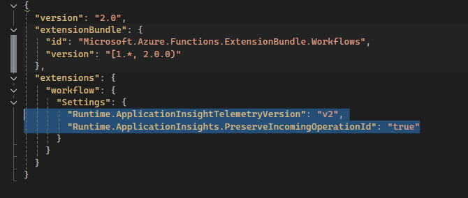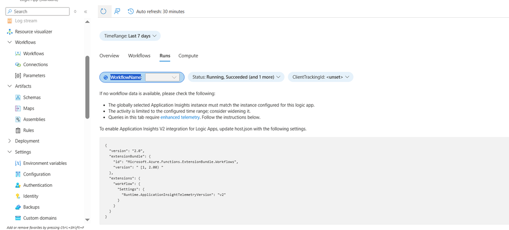 To effectively use the dashboards, your Logic Apps must be linked to Application Insights to enable telemetry collection. Additionally, it's crucial to ensure that your application uses the updated V2 schema for telemetry. Here are the steps to update the host.json file to implement the new schema.