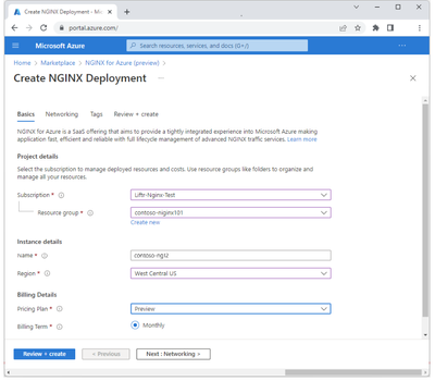 The service integrates the Nginx SaaS offering into the Azure infrastructure (Control Plane). Via this integration, you will be able to provision a new Nginx service and configure your Azure resources to leverage Nginx as a reverse proxy/load balancer.