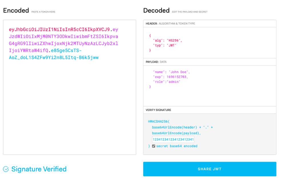 Note: for the test purposes you also need to add an `exp` field with a future date in a Unix Timestamp format