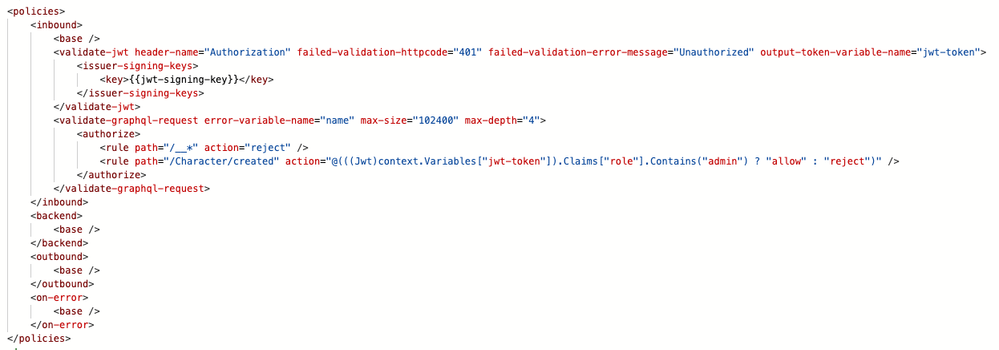 <validate-jwt header-name="Authorization" failed-validation-httpcode="401" failed-validation-error-message="Unauthorized" output-token-variable-name="jwt-token">