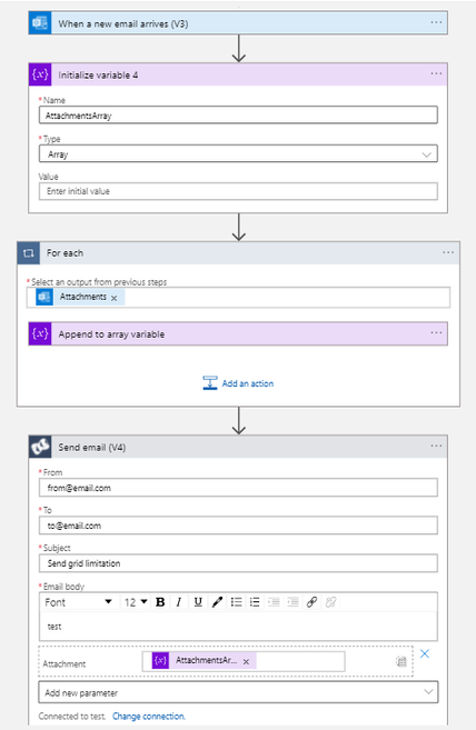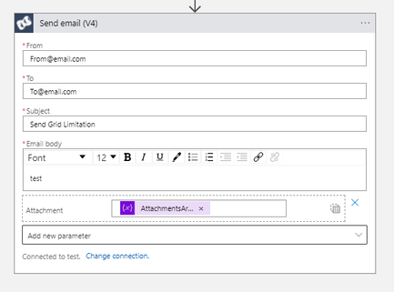 In the scenario when we have a logic app with O365 Trigger - when a new email arrives, and the email comes with multiple attachments; there is a current limitation in Send Grid connector -Send Email V4; where we cannot use the attachments array to send the received attachments all at once in one email.