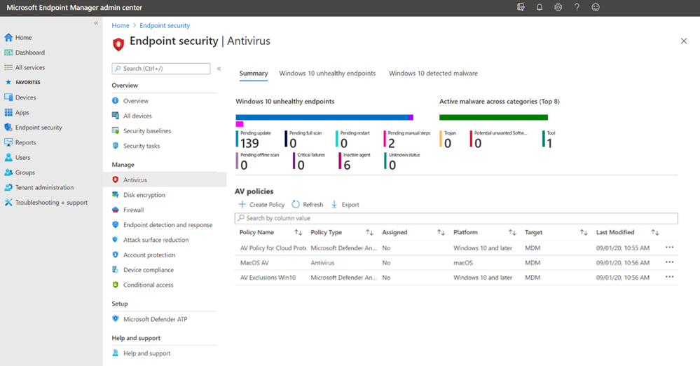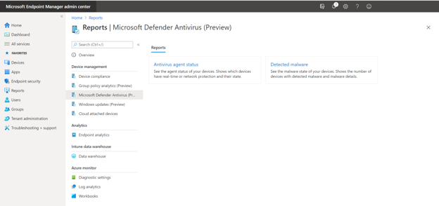 We are introducing new Microsoft Defender Antivirus reports in the Microsoft Endpoint Manager admin center to help you monitor your devices for status on malware and Antivirus states. You will be able to use two new operational reports to see which devices need your attention and two organizational reports to view general AV information.