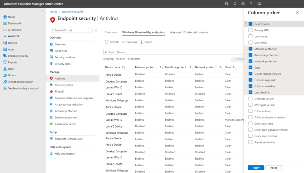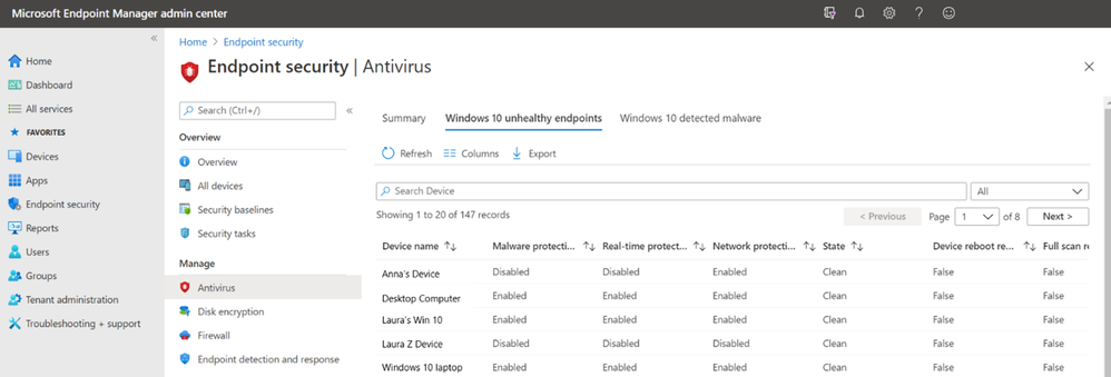 On the “Windows 10 unhealthy endpoints” tab, you can view the operational report for the threat agent status on devices and users to outline which are in a state that requires your attention. Each record will tell you if malware protection, real-time protection, and network protection are enabled or disabled. You can view the state of the device and additional information found in the extra columns to help identify next steps for troubleshooting.