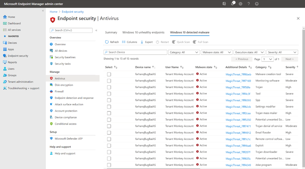 On the “Windows 10 detected malware” tab, you can view the operational report to see the list of devices and users with detected malware with details of the malware category. This will show the malware state of the device and counts of malware found on the device. You can take remote actions here including restart, quick scan, full scan, or update signatures to help remediate your devices.