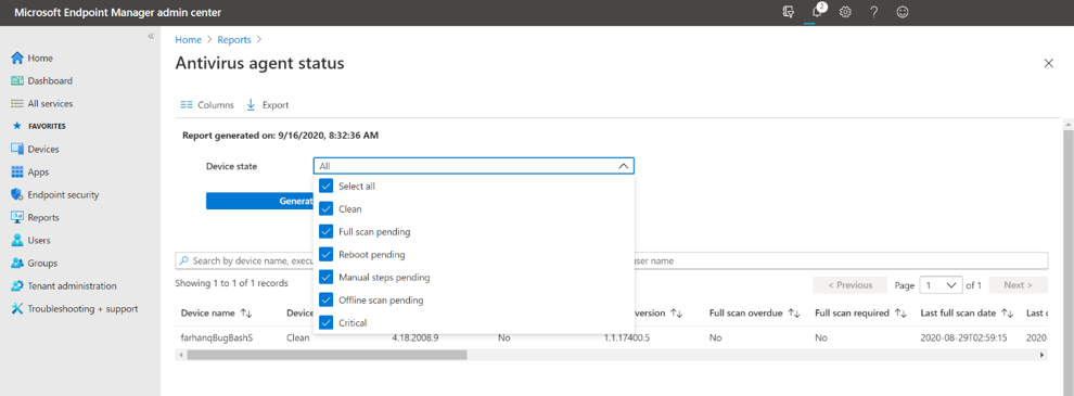 The first report, “Antivirus agent status” allows you to generate a report to view the list of devices, users and antivirus agent status information. You can start by selecting the filter for device state (i.e. clean, critical, reboot pending etc.) and select the columns you wish to have in view. Once the report has been generated, a timestamp shows how fresh the data is. You can search across the results, sort, use paging controls, see the number of records, and export to a .csv file. The data within the report will remain in your console up to 3 days before requiring you to generate again.