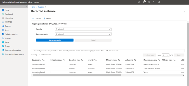 The second organizational report, “Detected malware”, works the same in such you can select the filters for severity and execution state to generate your report. This will show the list of devices and users with the count of detections found, the execution state, detection time, and malware state/category.