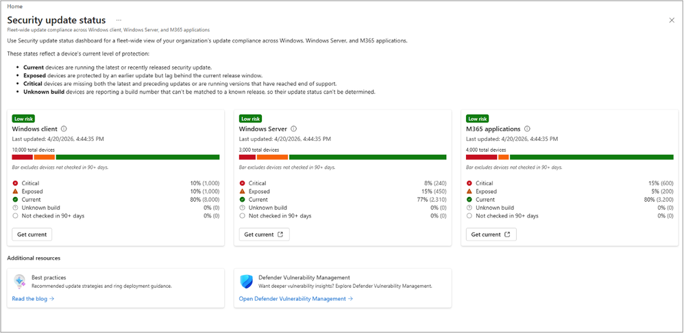 Reducing exposure starts with knowing where you stand. The security update status dashboard in Intune provides a single place to understand update status across Windows devices and Microsoft 365 Apps, helping you identify lagging systems and prioritize action.