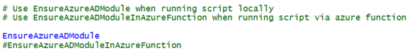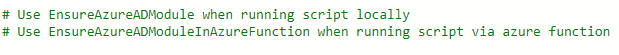 - If you are planning to run the GetMessagesTeamsOutlook script via the TimerTrigger Azure function, modify the script to use the EnsureADModuleInAzureFunction instead of EnsureAzureADModule.