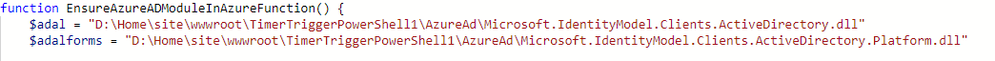 - To use EnsureADModuleInAzureFunction, the two DLLs in the script shown in the screenshot below need to be uploaded to the Azure function app. Note: These files will be on your machine if you have run the GetMessages script once locally. Depending on your Azure function app name and upload folder, you will need to modify the path specified in this portion of the script: “TimerTriggerPowerShell1\AzureAd”