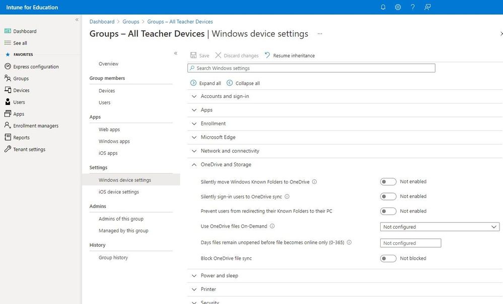 Figure 7 - Screenshot of the Intune for Education portal. The All Teachers Devices Group selected with the Windows device settings blade expanded highlighting OneDrive and storage settings.