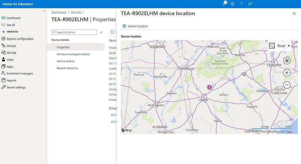 Figure 6 - Screenshot of the Intune for Education portal. A device properties is selected and Locate Device location shown on map.