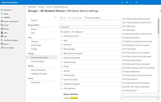 Figure 2 - Screenshot of the Intune for Education portal. The Windows device settings are expanded under on the All Students Devices Group. Using new search box using time zone to highlight Configure time zone setting.