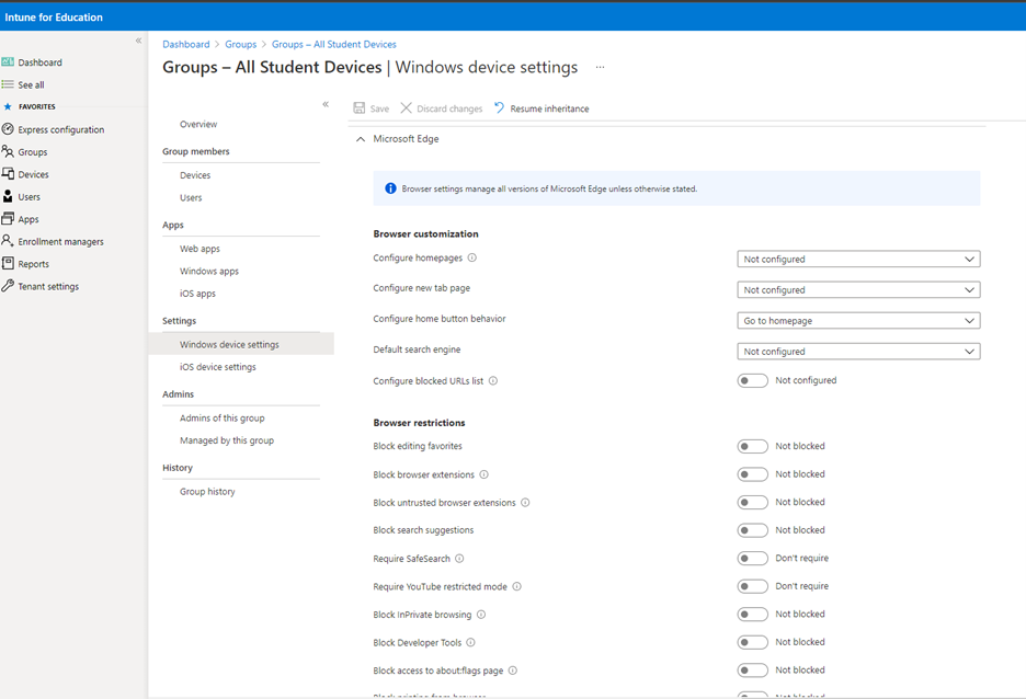 Figure 3 - Screenshot of the Intune for Education portal. The Windows device settings are expanded under on the All Students Devices Group. Expanded on Edge Browser Settings.