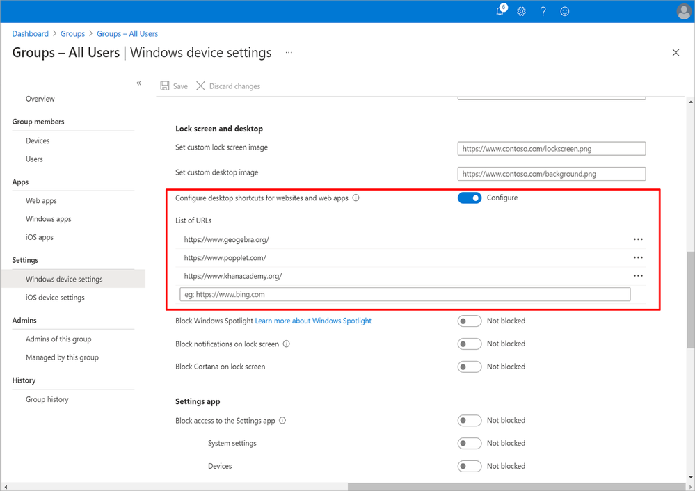 Figure 4 - Screenshot of the Intune for Education portal. The Windows device settings are expanded under on the All Users Group. Windows device settings blade expanded highlighting Configure desktop shortcuts for websites and web apps setting.