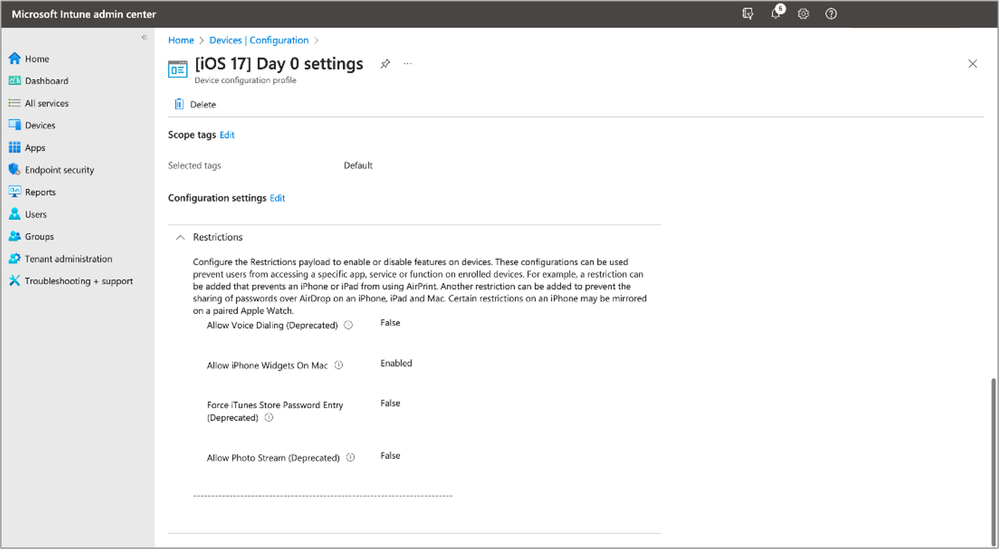 See iOS/iPadOS 17 and macOS 14 settings updates in the Intune admin console.