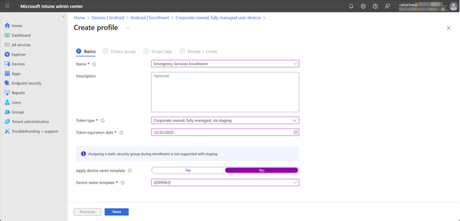 For police departments, data sensitivity is paramount. Officers need access to real-time intelligence, case files, and communication tools without risking exposure of confidential information. While there are other options to enroll Android devices in Intune (you can see an overview here), setting up corporate-owned, fully-managed Android tablets with Intune can deliver the data protection and device lock-down that police departments need, while ensuring police officers remain productive. Users won’t be able to change pre-defined configurations and install applications from the public store. These devices are associated with a single user, in this case a police officer, as they aren’t intended for shared use. To ensure minimal disruption in the working day of these users, IT admins can use device staging to decrease the number of steps needed to enroll a brand-new device and get it to a functional state.
