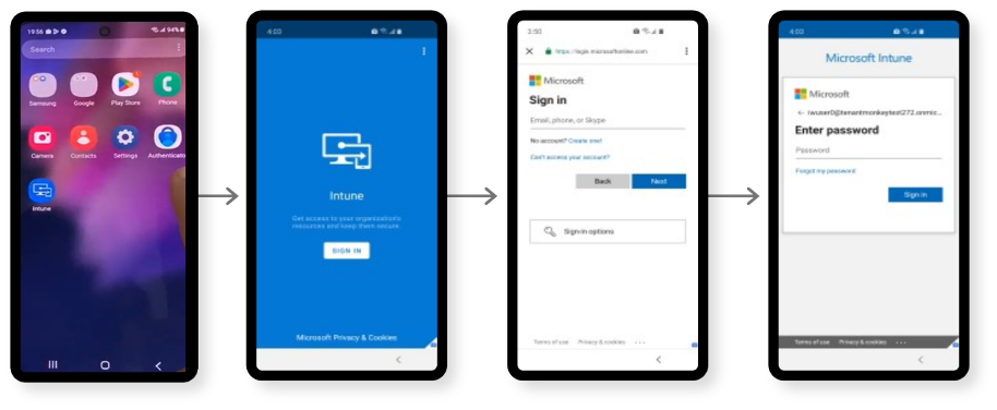 In the picture below, you see the steps users go through to complete enrollment which requires authentication using the Intune application, so that apps and policies assigned to that user identity are applied.