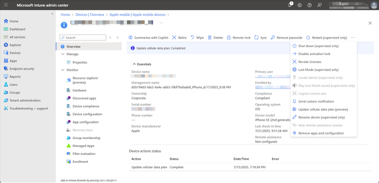 - Remote actions and support: IT teams can monitor, lock, or wipe devices remotely through Intune, with supervision mode enabling deeper administrative controls, such as Lost Mode and Locate Device.