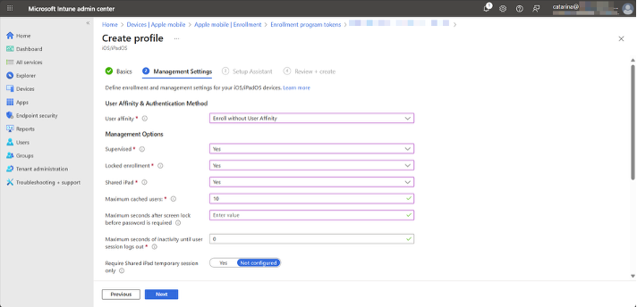 Below is an ADE enrollment profile configured to setup devices as Shared iPads: