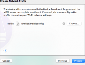 In Choose Network Profile dialog box, choose the mobileconfig file you created in Step 3 and click on Prepare