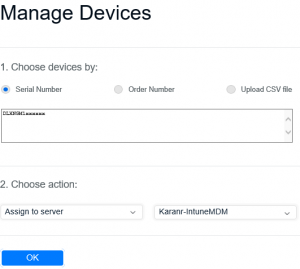 In Apple DEP portal, Click on Manage Devices and paste the Serial Number. Assign it to MDM server linked with DEP Enrollment configuration in Intune. Click on OK and OK