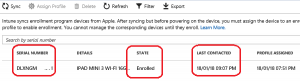 Go to deploy.apple.com and enter your creds. Under Device Enrollment Programme - Manage Servers , you will now see a new MDM server in the list called " Device Added by Apple Configurator 2 ". Click on it and in the top right corner, click on Download Serial Numbers. Open the csv file. Confirm Serial_No matches with what you see on the back of the device. Copy the serial number and click on OK
