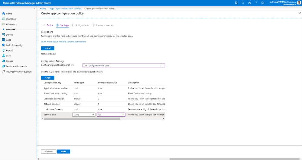 From the Configuration settings format drop-down menu, select Use configuration designer and choose Add to open a panel with all the available Managed Home Screen configuration keys.