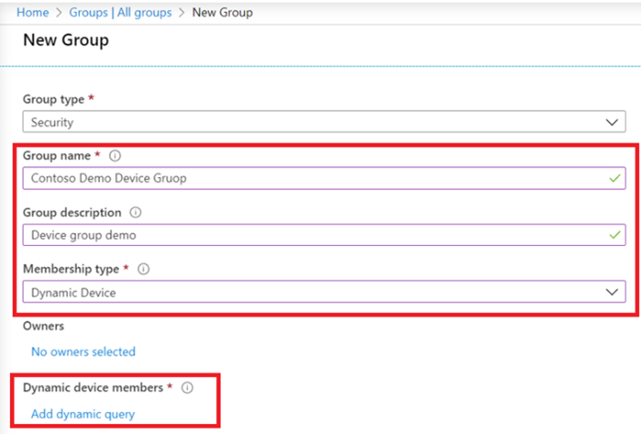 Change Membership type to Dynamic device. And then Add a dynamic query. Use dynamic queries so that your device is automatically added to a group based on the property of your choice. This way, you don’t need to manually add devices to groups post-enrollment. If you prefer to add members manually, change the Membership type to Assigned.