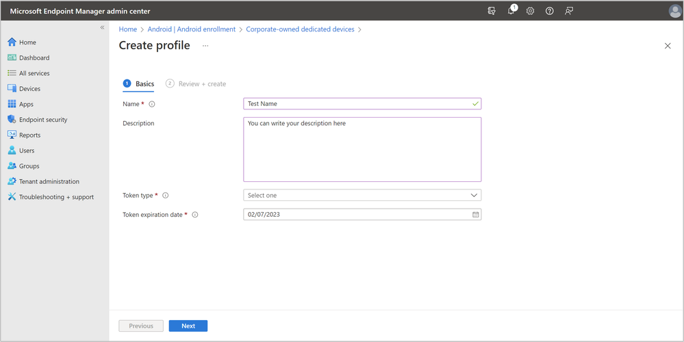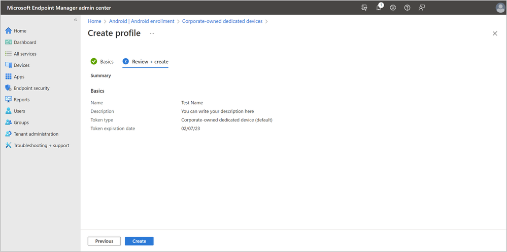 Create an enrollment profile to generate an enrollment token and attach it to a device group. Note that this step assumes you have already set Intune as your MDM authority and that you have connected your Intune account to your Managed Google Play account.