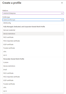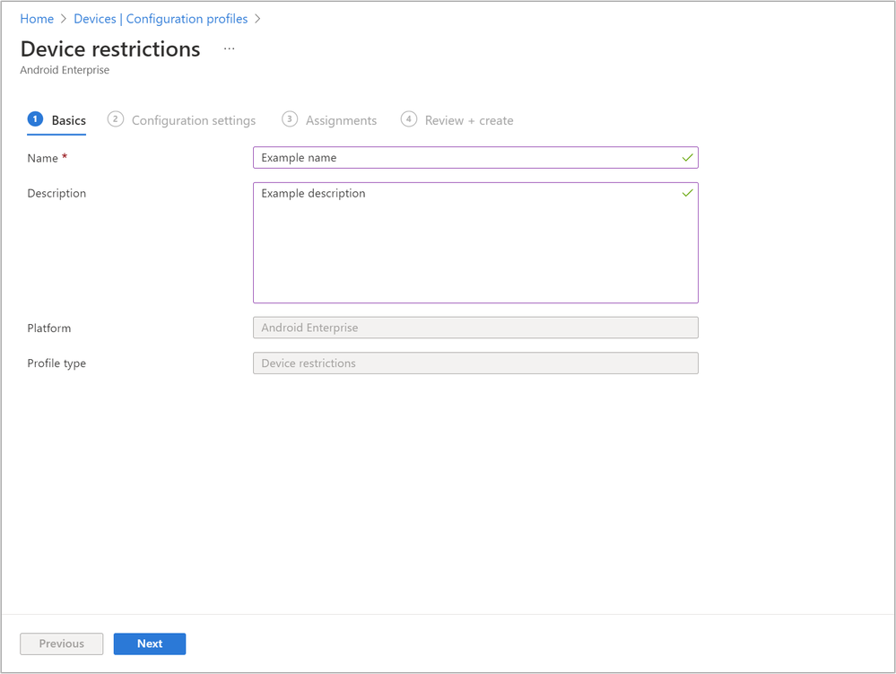 Fill in the Name and, if desired, a Description. For platform, choose Android Enterprise, for profile type, select Fully Managed, Dedicated and Corporate-Owned Work Profile Only, and for targeted app, select Managed Home Screen. Choose Next when you’re ready to continue.