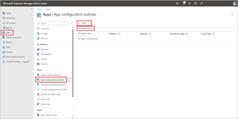 In the Microsoft Intune admin center, navigate to Apps > App configuration policies > Add > Managed devices.