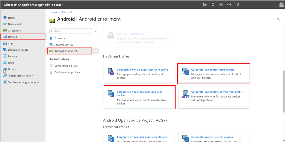 In the Microsoft Intune admin center, navigate to Devices > Android > Android enrollment and select your management mode: Corporate-owned dedicated devices or Corporate-owned, fully managed user devices.