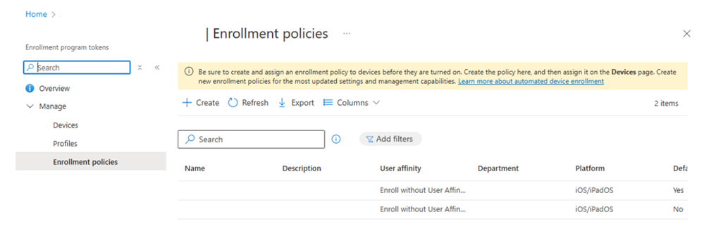 Create a new enrollment policy for iOS/iPadOS and macOS ADE