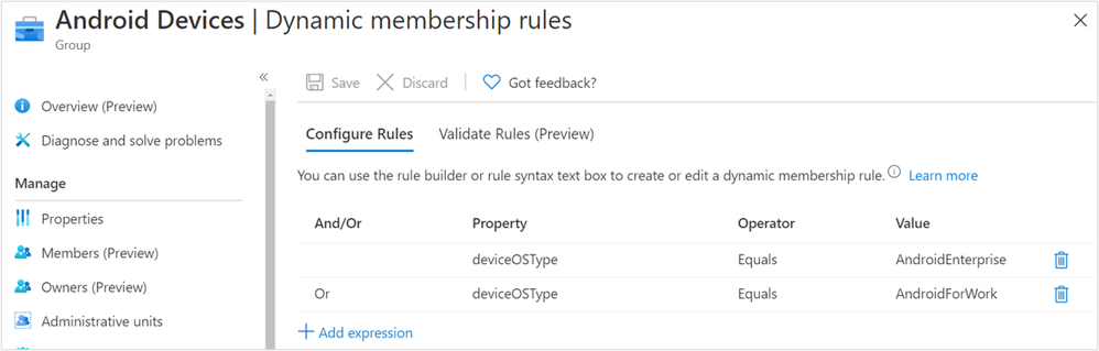 As an example, I have created three Azure AD dynamic device groups based on the property deviceOSType – Android Devices, iOS Devices, and Windows Devices: