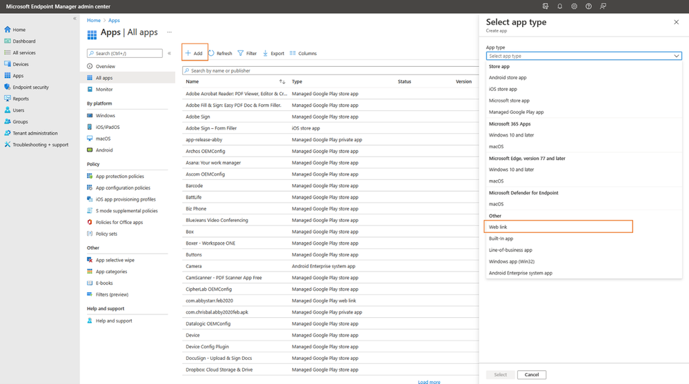 Microsoft Endpoint Manager admin center > All apps blade with the "Add" and "web link" options highlighted.