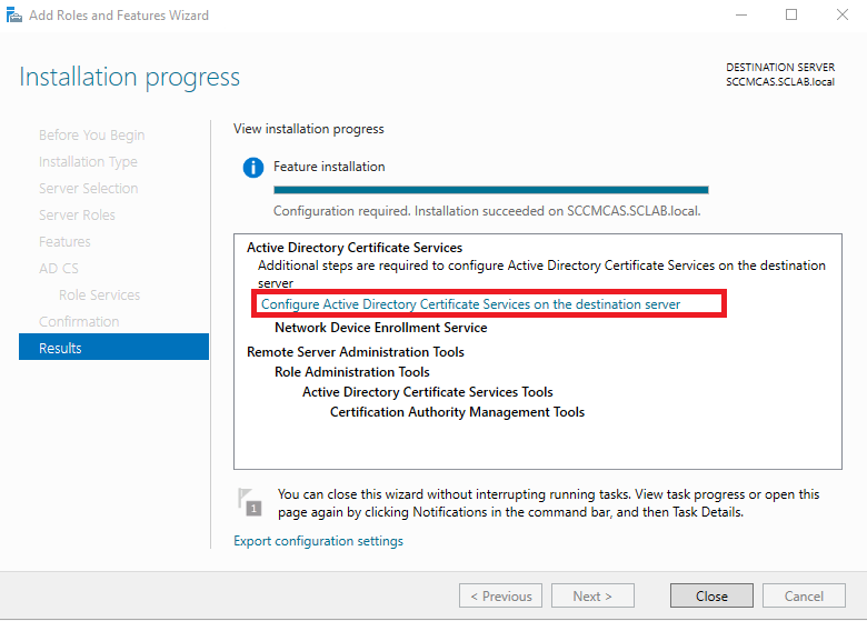 Continue through the wizard to complete the installation of NDES. Once the installation completes, we now need to do a few steps to finish configuring the NDES computer.