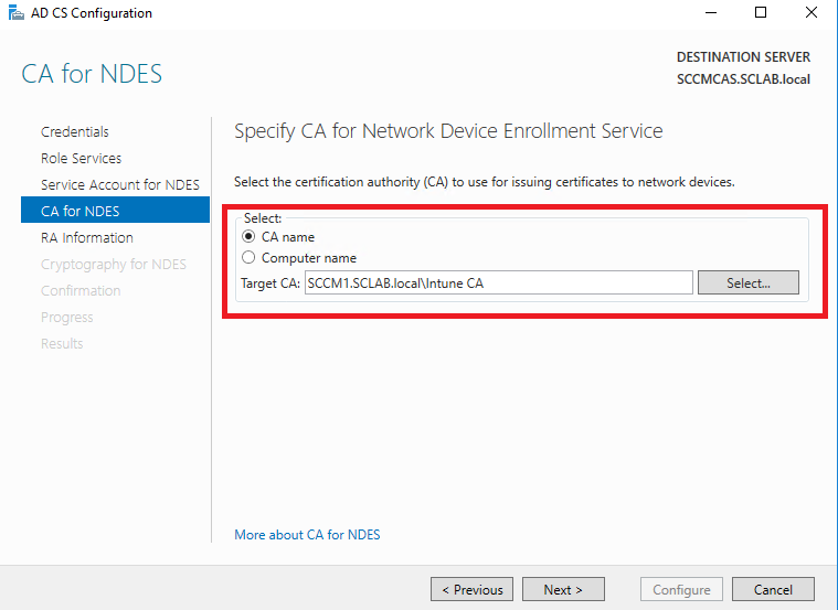 Now we need to connect your Enterprise CA with the NDES server. Please note that the CA and the NDES server must be installed on separate servers.