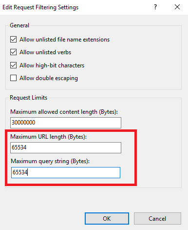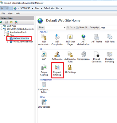 The NDES server needs to accept long URL requests so we first need to configure IIS accordingly. On the NDES computer, open IIS Manager and select Default Website -> Request Filtering then select Edit feature settings’: