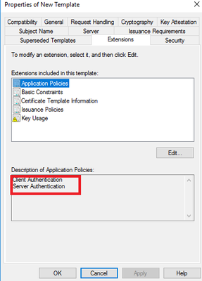 On the Extensions tab, make sure that Client Authentication is available under Application Policies.