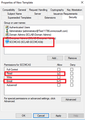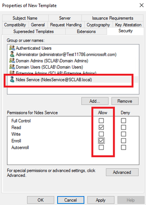 Now, add Read and Enroll permission to the NDES service account for the new template on the Security tab. On the Cryptography tab, the minimum key size should be 2048.