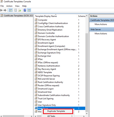 Log on to your Enterprise CA and launch the CA console. Go to Certificate Templates and right-click on Manage, then duplicate the Web Server template: