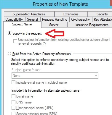 Give your new template a display name and make a note of the generated Template name as you will need this later. On the Subject Name tab, select the Supply in the request option: