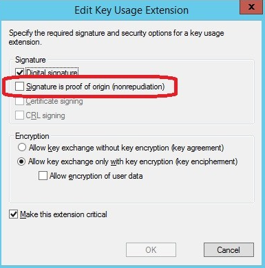 On the same tab, click on Edit and un-check the option Signature is proof of origin (nonrepudiation). This is required if the certificate is going to be assigned to iOS devices. Also make sure that you do not allow the private key to be exported on the Request Handling tab: