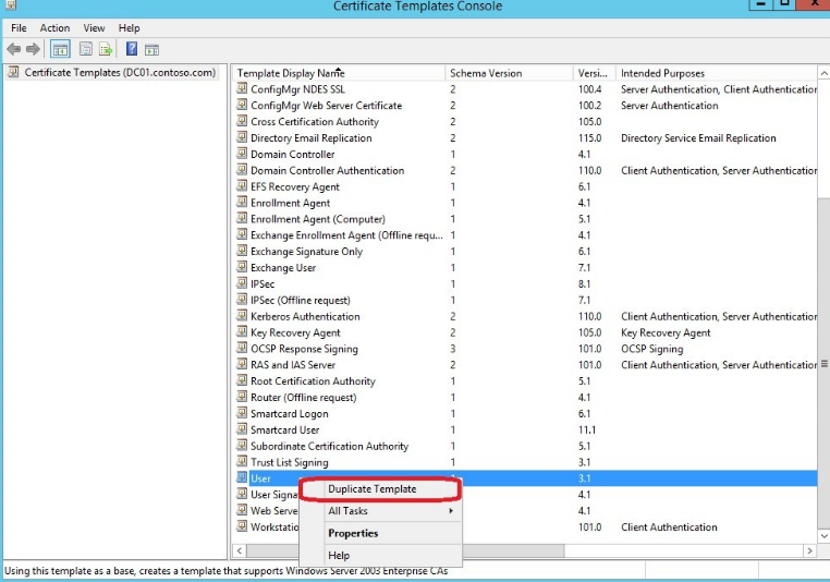 The next step is to create the NDES certificate template. This template will be used to issue certificates to our Intune devices. Log on to your Enterprise CA and start the CA console. Right-click on Certificate Templates and select Manage), then duplicate the User template: